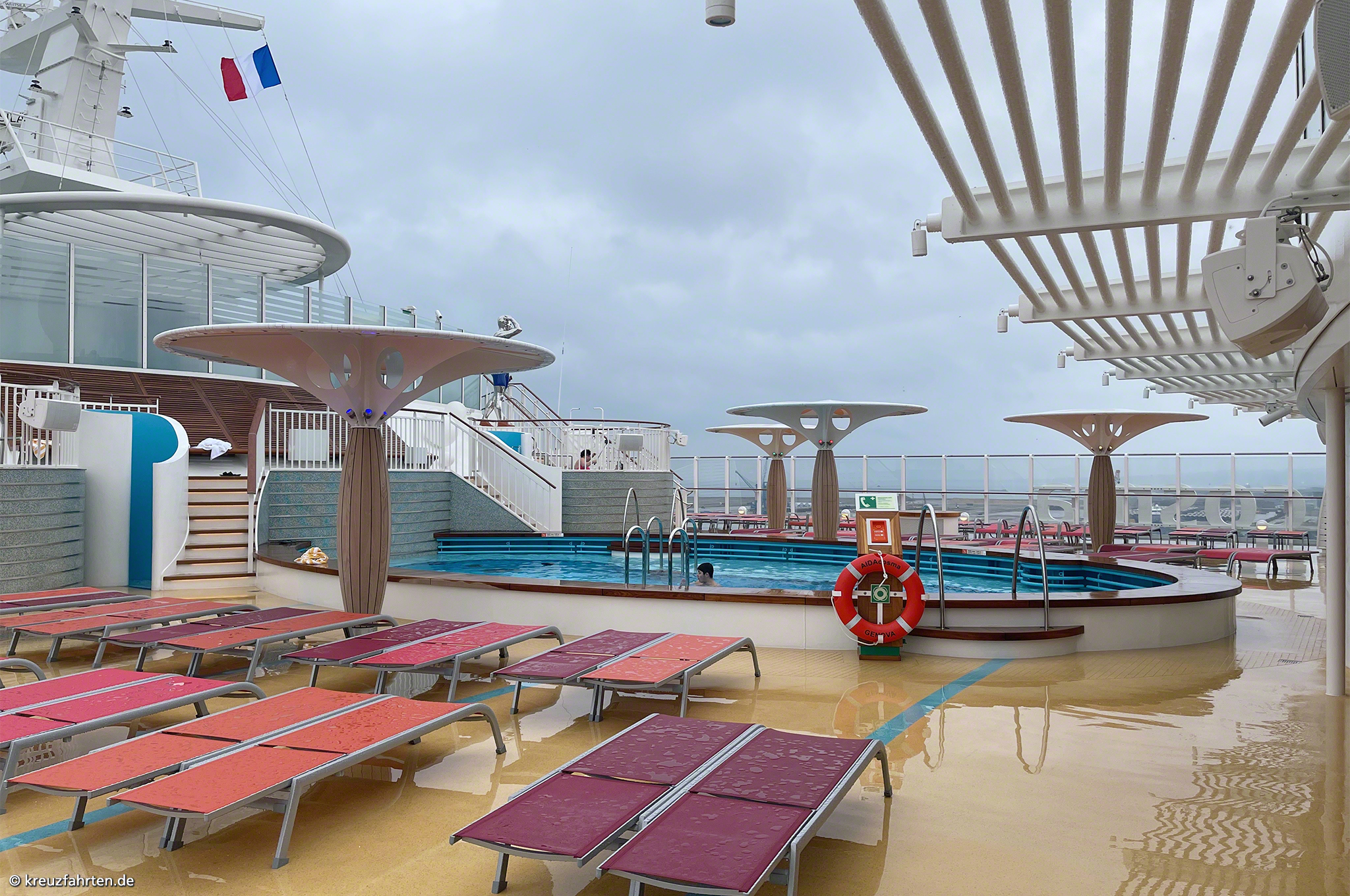 Der Fitnessbereich Body & Soul Sport verbindet gekonnt Sport, Spaß und Spiel: angefangen beim Training auf Power Plates in Gruppen über die neue Boulder-Wand bis hin zum Outdoor-Feld für unterhaltsame Ballspiele. Zudem regt eine Laufstrecke zum Joggen an und verschiedene Cardio- und Kraftgeräte zum gesunden Auspowern. Sie müssen an Bord beispielsweise auch nicht auf Ihr Pilates-Training verzichten. Noch Wünsche offen? Um gezielt zu trainieren, bietet sich beispielsweise ein Fitness-Check mit Ernährungsberatung mit anschließendem Personal Training (Service gegen Gebühr) an. Weiter ist auch Indoor-Cycling möglich oder ein Ganzkörper-Workout per TRX-Training. Nicht zu vergessen ist das Pooldeck, das sich über eine komplette Schiffsbreite erstreckt!