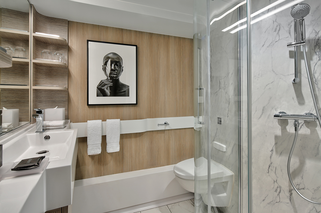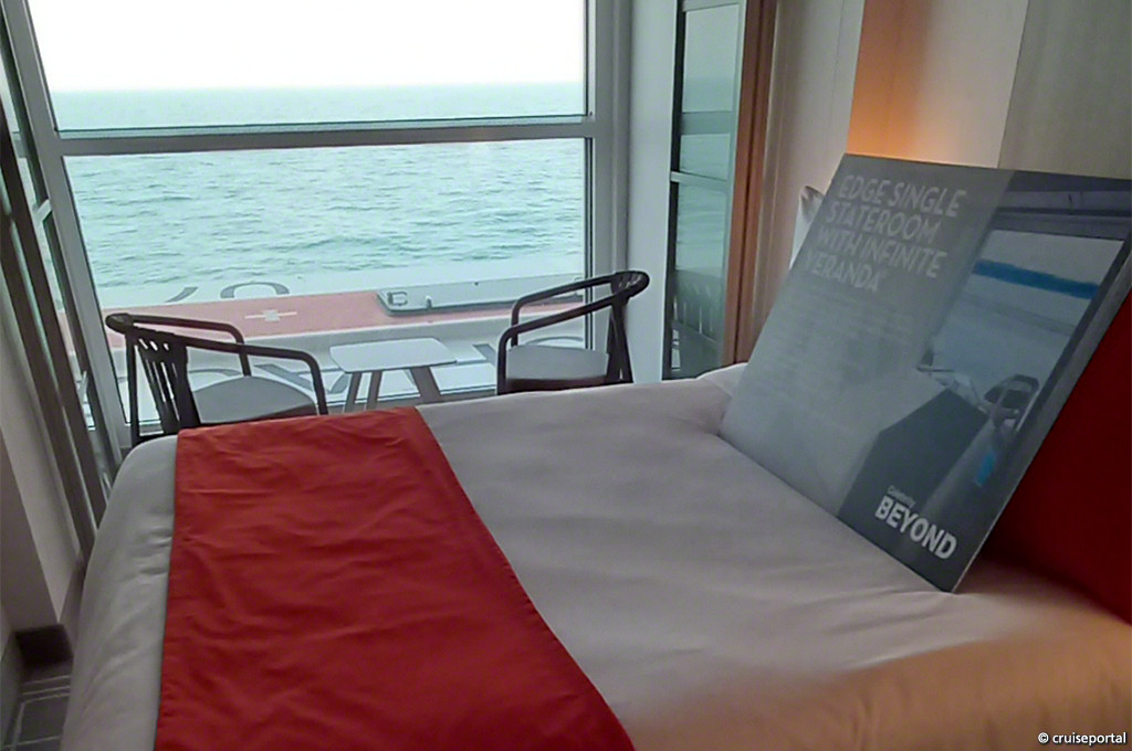 Alleinreisende finden in den sogenannten Edge Single Staterooms mit Infinite-Balkon einen geräumigen Rückzugsort, der keine Wünsche offen lässt. Sie sind samt Veranda rund 17 Quadratmeter groß und umfassen bequemes Mobiliar wie ein Einzelbett, Safe, Minibar und Sitzecke sowie ein Badezimmer mit Dusche und WC.