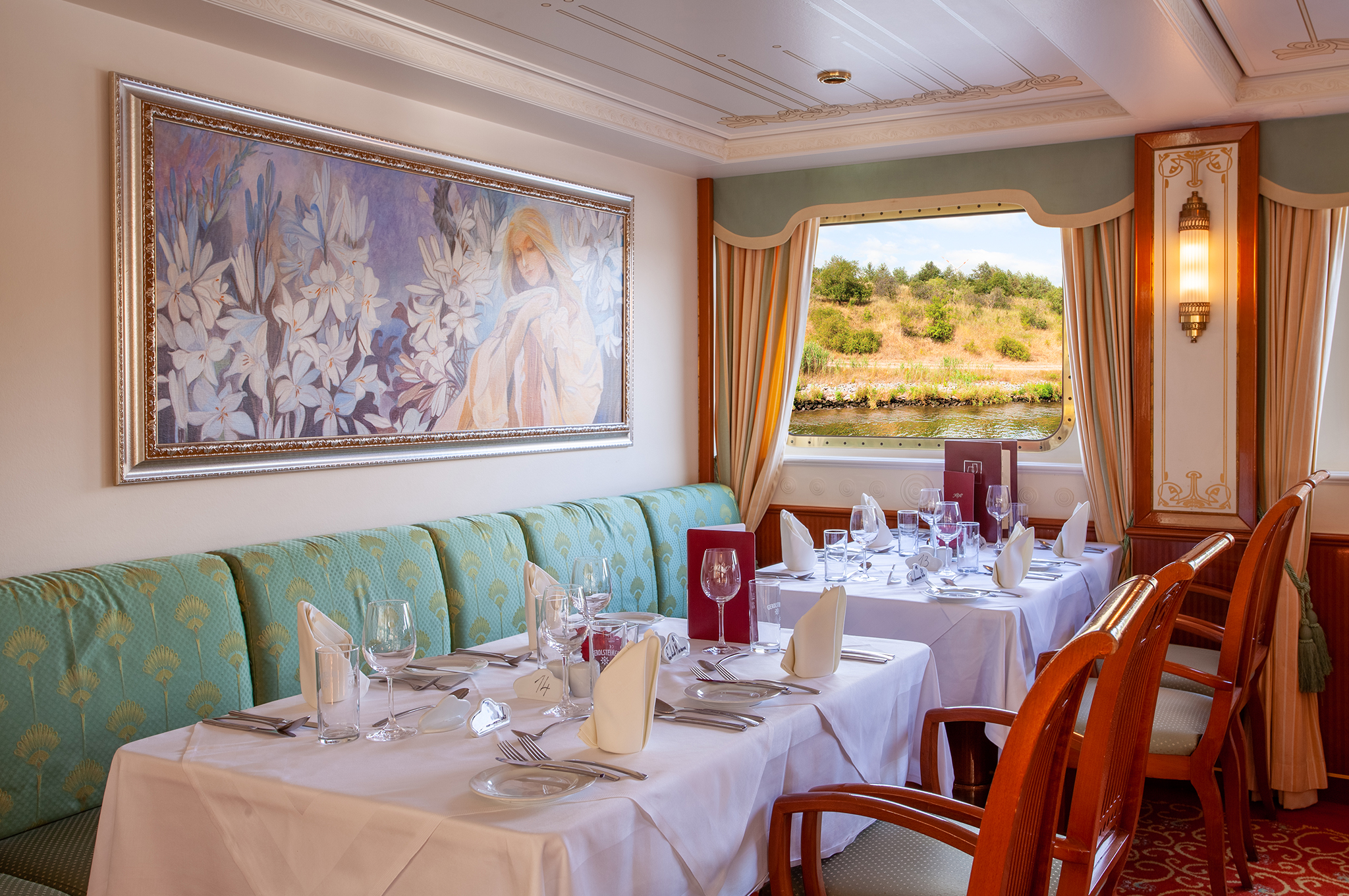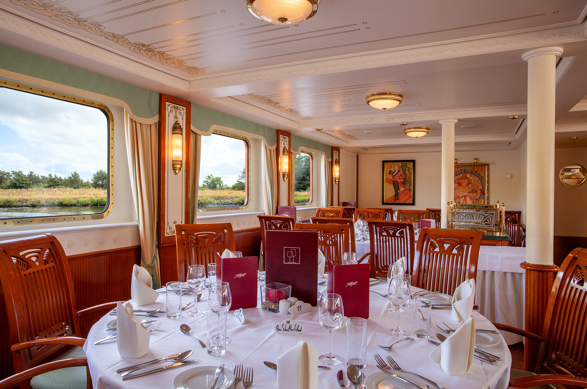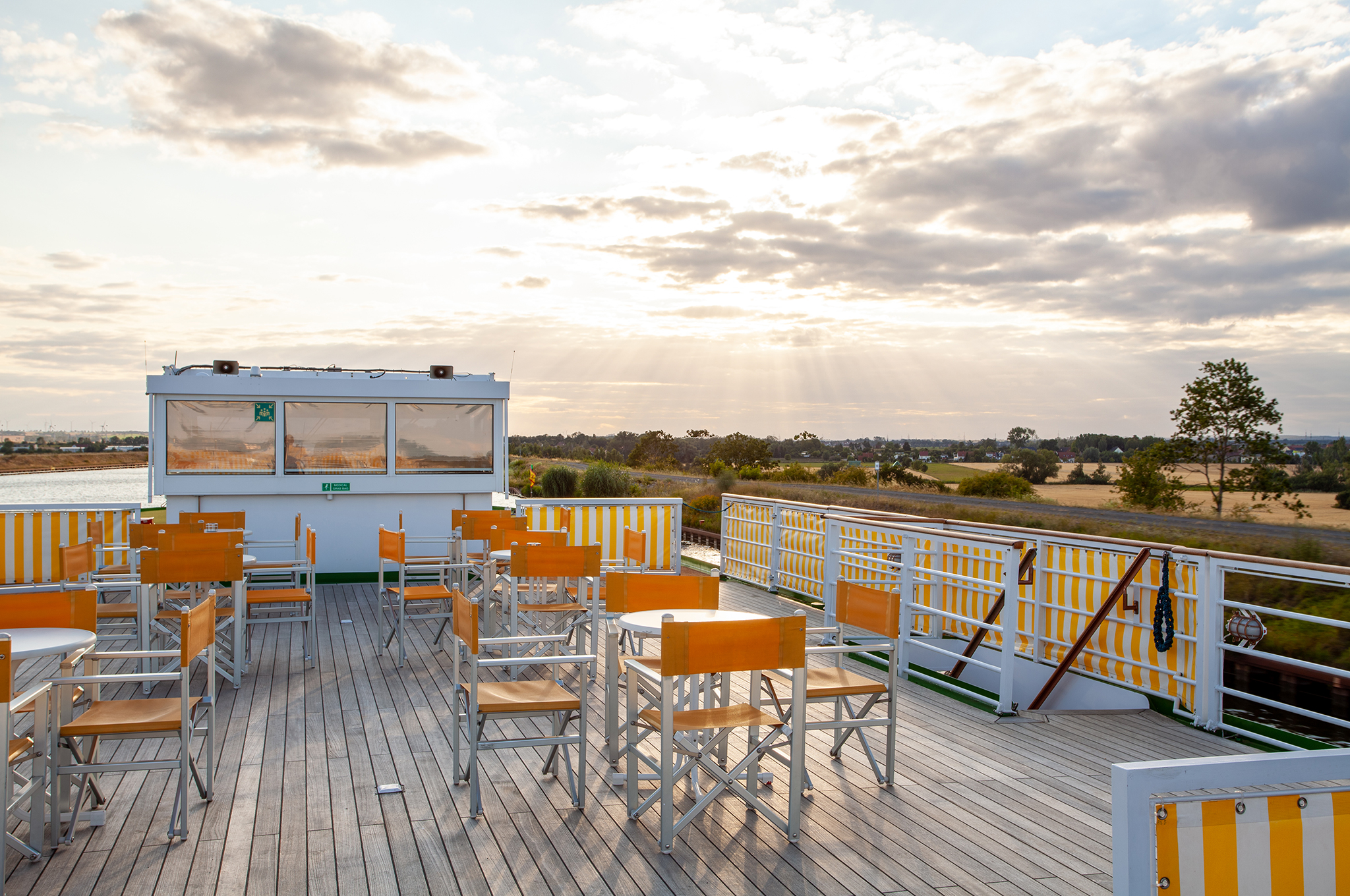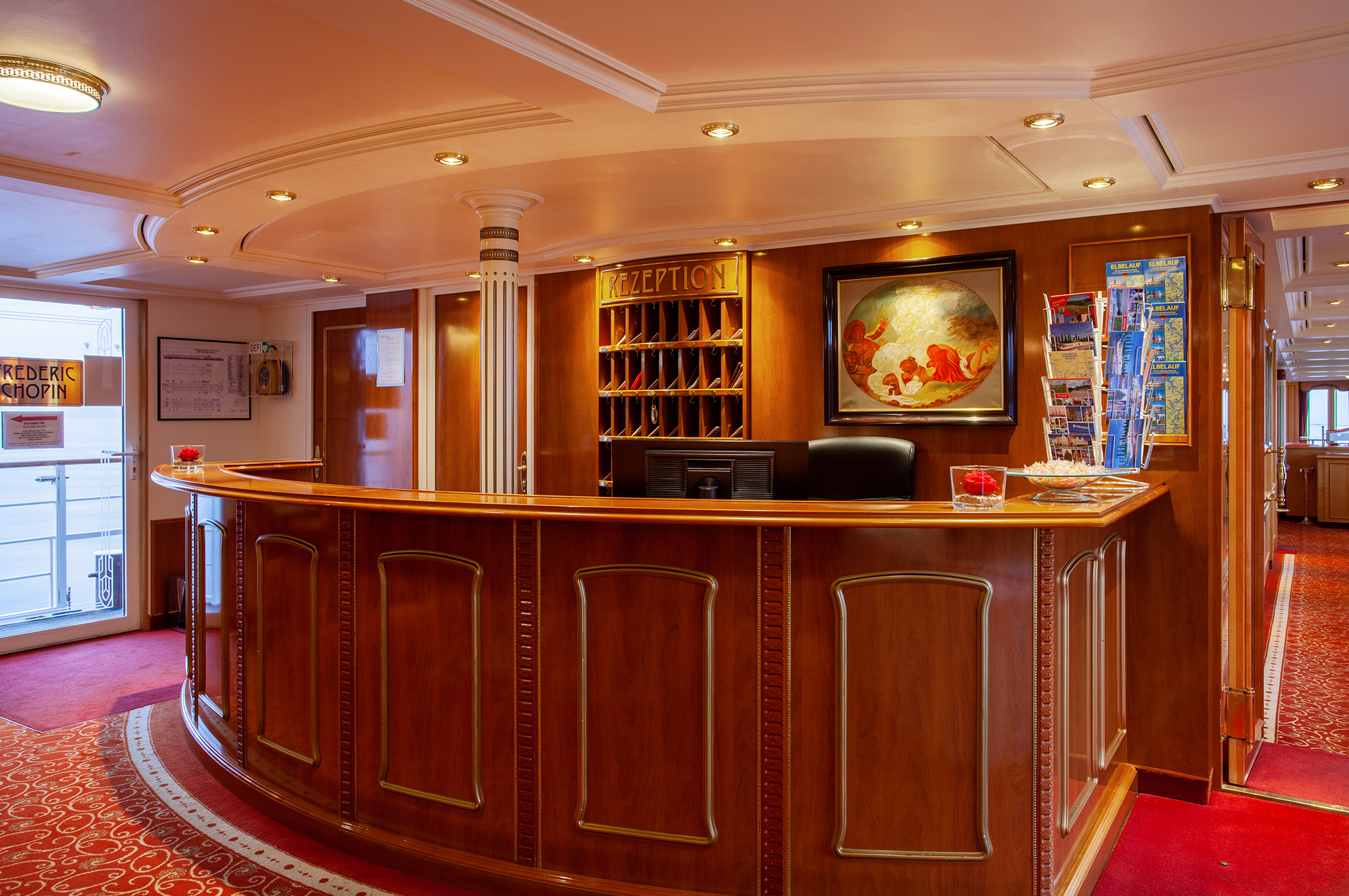 Entspanntes Sightseeing ohne lästiges Koffer auspacken: Auf der MS Thurgau Chopin entdecken Sie traumhafte Sehenswürdigkeiten, historische Städte und traumhaftes Naturpanorama entlang von Oder, Havel, Elbe und Moldau. Wie wäre es mit Hamburg oder Dresden? Das charmante Flusskreuzfahrtschiff nimmt 84 Passagiere in 42 Außenkabinen mit auf seine Reisen und bieten das perfekte Zuhause auf Zeit. Besonders beliebt sind Kabinen am Oberdeck, die über einen französischen Balkon verfügen. Das Panoramarestaurant auf dem Hauptdeck bildet den gastronomischen Mittelpunkt der MS Thurgau Chopin. Morgens beginnt der Tag mit einem üppigen Frühstücksbuffet, am Abend tischt das Servicepersonal mehrgängige Menüs auf. Im Panoramasalon auf dem Oberdeck kommt die Gäste gerne auf eine Erfrischung oder einen Kaffee zusammen. Abends lädt der Bordpianist zur Livemusik am Klavier ein. Auf demselben Deck befinden sich zudem die Rezeption und der Souvenirshop.