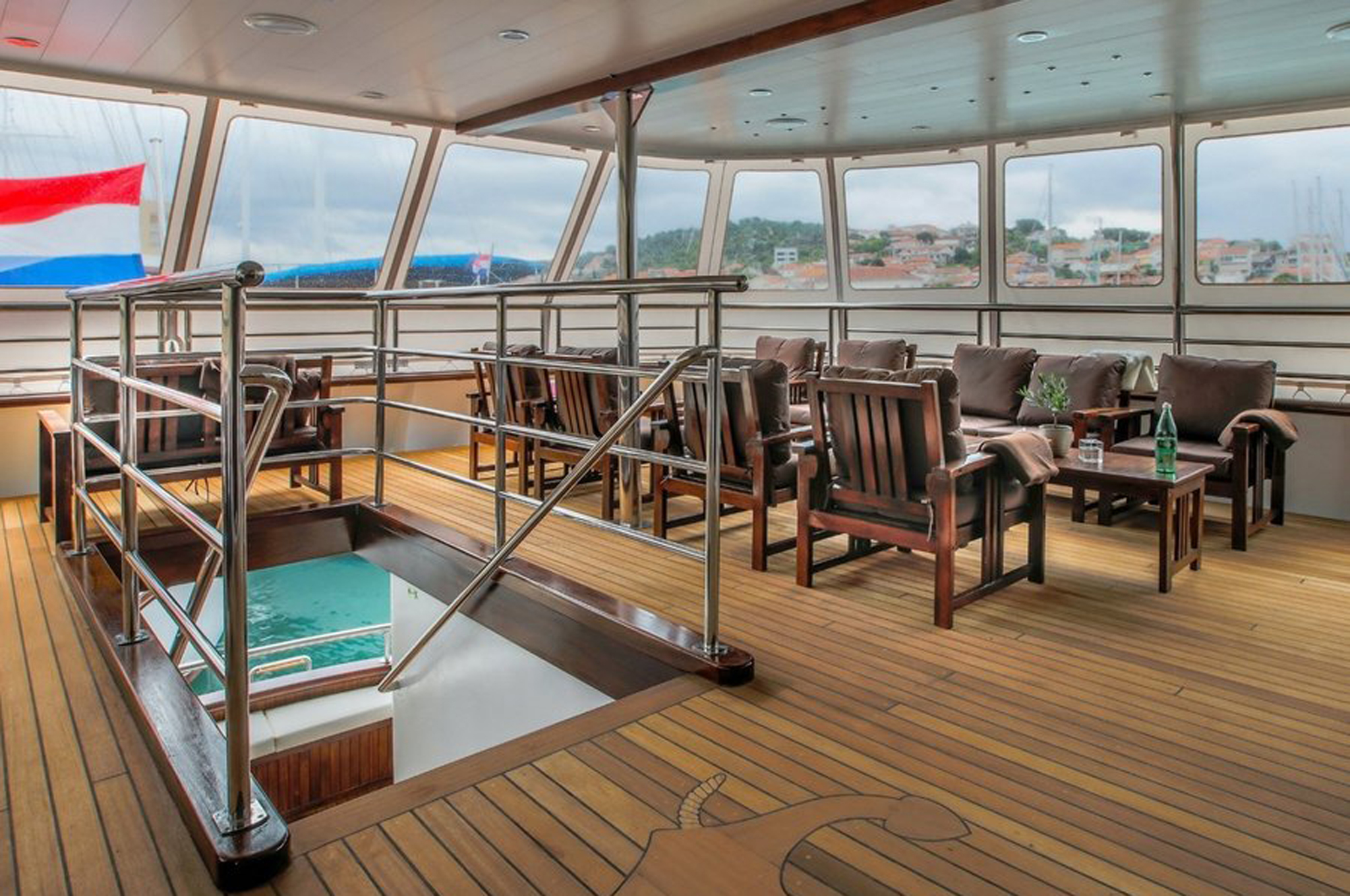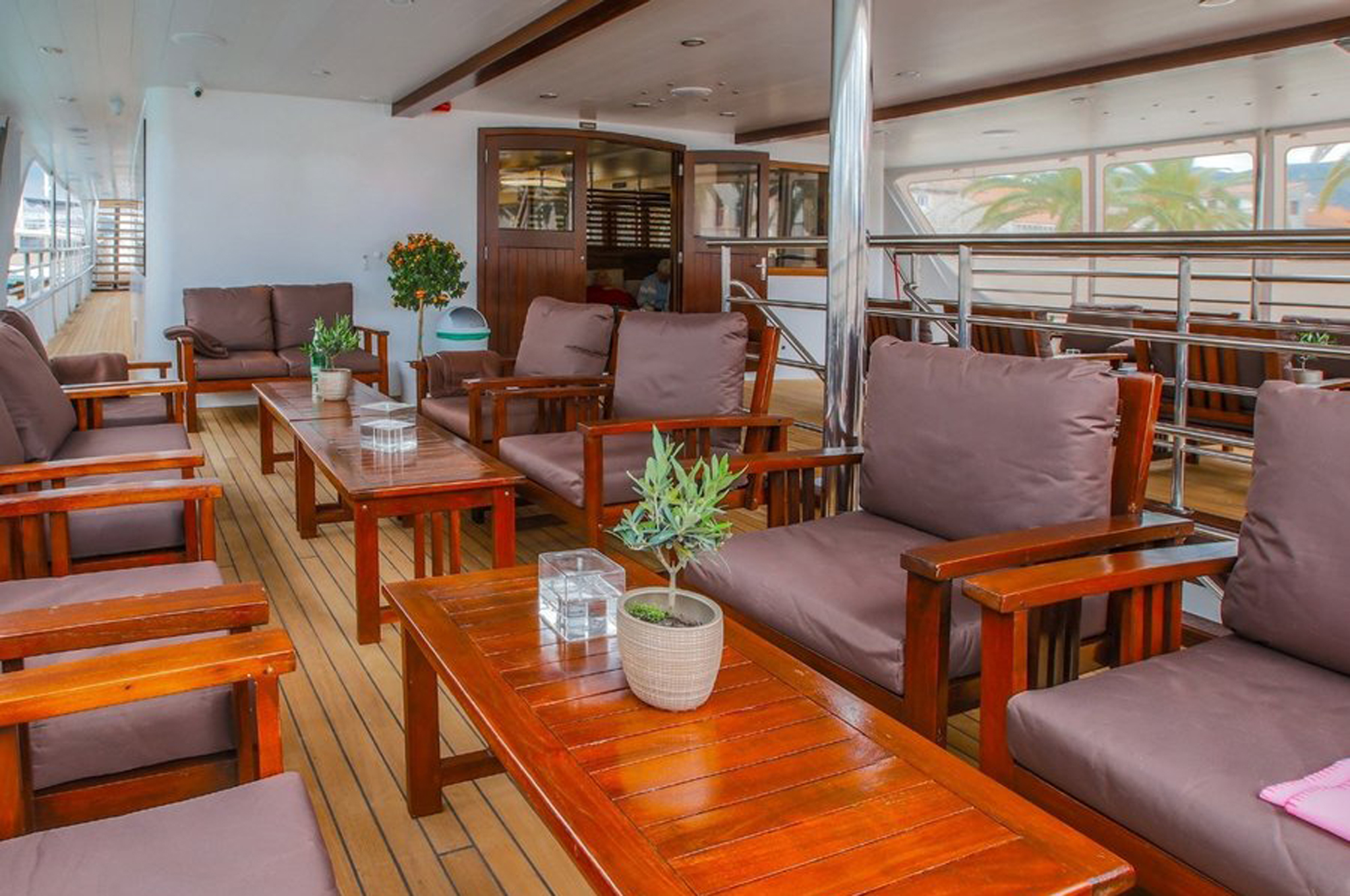 Wie praktisch es ist, dass die Sonnenterrasse über eine Bar verfügt. So können Sie auf Ihrer Liege entspannt an einem Drink nippen, während neben Ihnen die Landschaft vorbeizieht. Zu späterer Stunde genießen Sie von hier aus zudem die herrliche Aussicht auf einen Sonnenuntergang über dem Wasser.