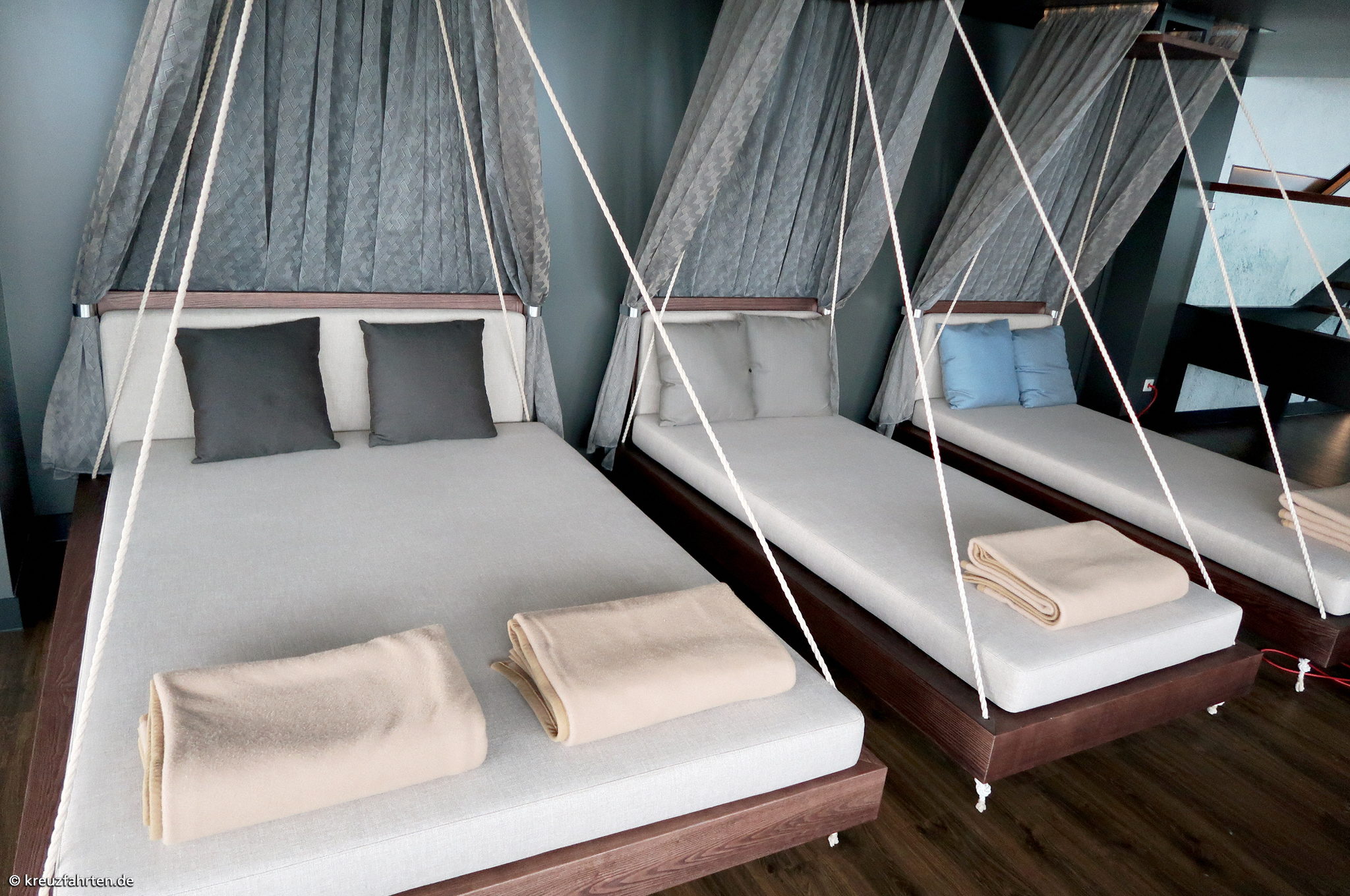 In den Balkonkabinen der Mein Schiff 1 bis Mein Schiff 7 hängt die Bettposition von der Lage der Kabinentür ab: Befindet sich die Tür beim Eintreten links, steht das Bett direkt am Fenster. Liegt die Tür rechts, ist das Bett mittig im Raum platziert. Diese Regel gilt für seitliche Außen- und Balkonkabinen, nicht für Kabinen am Bug.
