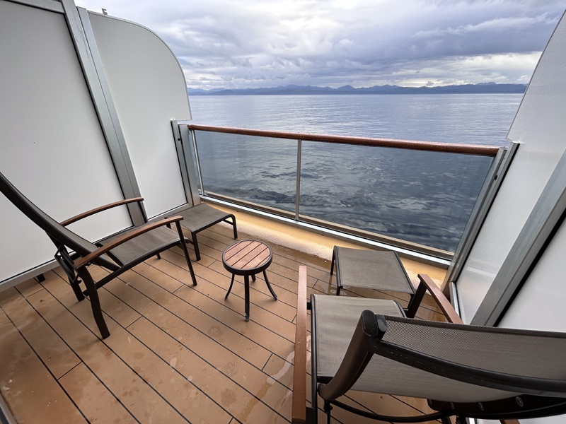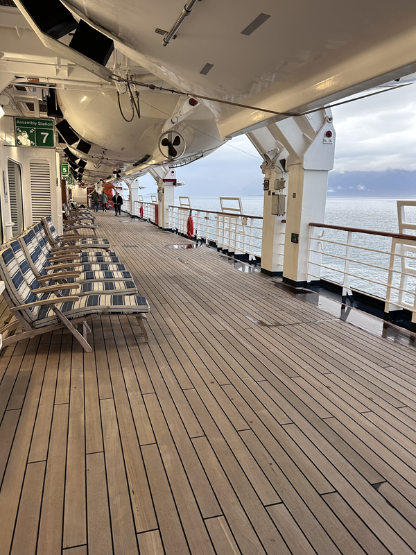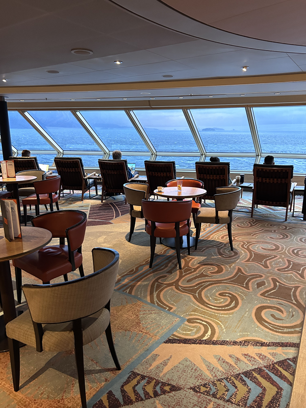 Nachdem wir den Pike Place Market, das Neue Waterfront Viertel und das dortige Aquarium und Riesenrad erkundeten und erlebten, fuhr unser Shuttle zur Eurodam ab. Der Hafen (Pier 91) ist nicht direkt in der Stadt, aber gut per gebuchtem Shuttle, Uber oder Taxi in ca. 30 Minuten zu erreichen. Die Eurodam bietet Platz für ca. 2100 Passagiere. Eine super angenehme Schiffsgröße und viel Platz an Bord. Das Baujahr 2008 merkt man dem Schiff durchaus an, allerdings wurden bereits einige Renovierungen vorgenommen. Blickt man z.B. in die Crow’s Nest Observation Lounge inkl. Café auf Deck 11 im Bug, meint man auf einem brandneuen Schiff zu sein. Das Promenadendeck (Deck 3) mit Teakholz bringt den nötigen Schiffsflair und bietet die Möglichkeit Runden um das komplette Schiff zu laufen oder auf einer der Liegen zu entspannen.