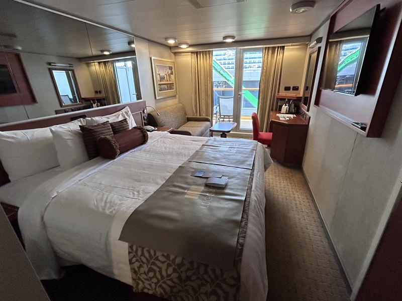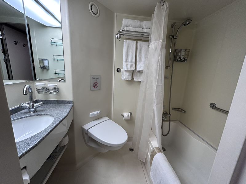 Die Einschiffung verlief schnell und einfach. Nach Durchführen des Web Check-In‘s, kann man sich Bordkarte und Kofferanhänger ausdrucken und benötigt außerdem nur noch den Reisepass. Meine Verandakabine auf Deck 4 war direkt bezugsbereit und die Koffer standen wenig später auch schon in der Kabine. Meine Kabine der Kategorie VB Nr. 4145 befindet sich nahe am Aufzug, ist geräumig und bietet neben einem großen Bett, ein Sofa, einen Schreibtisch inklusive Stuhl, einen Fön und ein Badezimmer mit Badewanne und Duschvorhang (Nur in den Suiten befindet sich teilweise noch eine zusätzliche Dusche). Außerdem befinden sich auf der großzügigen Veranda zwei Stühle und Fußablage, sowie ein kleiner Tisch. Für das Mittagessen habe ich mich für einen schnellen Snack im Lido Market (Deck 9) entschieden. Am Einschiffungstag ist dort ziemlich viel los, aber dennoch findet sich schnell ein Tisch. Das Essen ist zwar in Buffetform, wird aber vom Servicepersonal auf den Teller gereicht.
