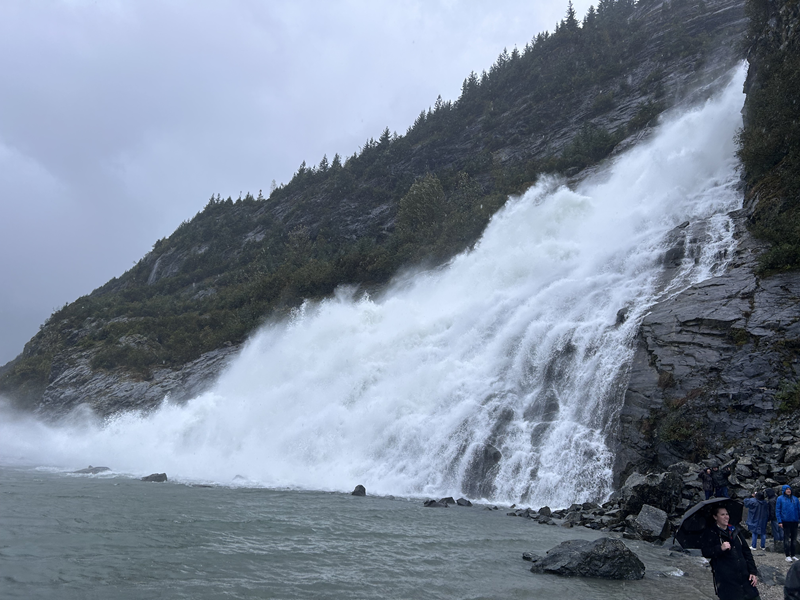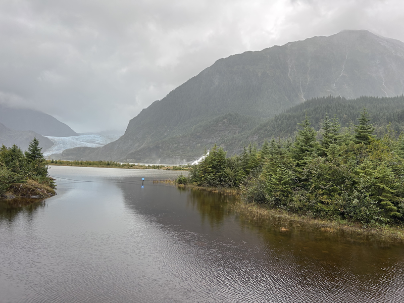 Wir legten am Morgen direkt in Juneau an und entschieden uns mit dem öffentlichen Bus zur Station Mendenhall Valley und von dort zu Fuß zum Mendenhall Gletscher zu laufen (etwa 30-minütiger Spaziergang). Die Busstation befindet sich nur etwa 500m vom Schiff entfernt. In Juneau legen häufig mehrere Schiffe gleichzeitig an, dennoch waren im Bus ausreichend Plätze frei. Allerdings hat es leider den ganzen Tag geregnet, doch mit entsprechender Kleidung war auch das kein Problem. Eine Regenjacke und –hose sind für diese Route definitiv zu empfehlen. Ende September ist bereits das Ende der Saison und daher mit viel Regen zu rechnen.