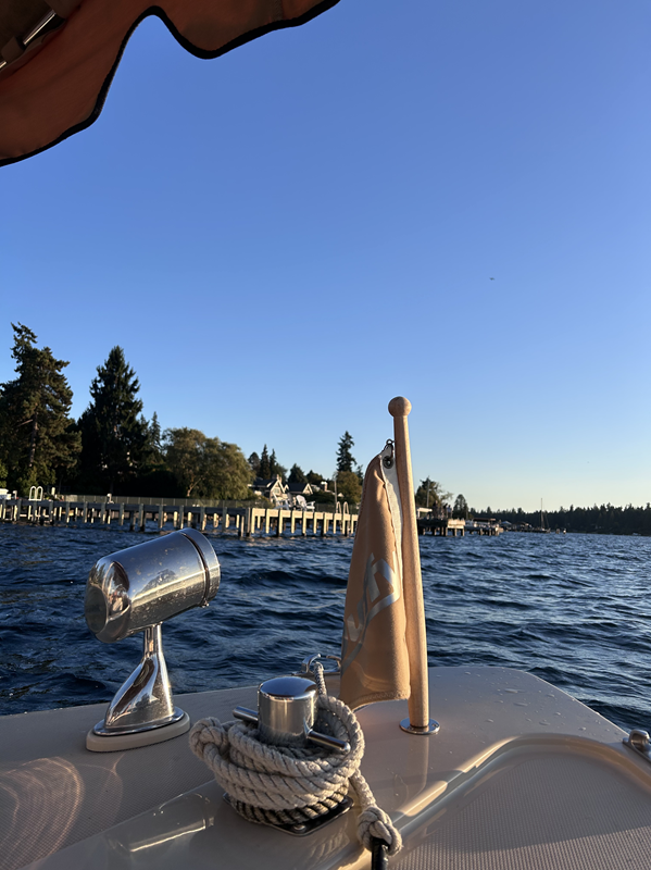 Wir trafen uns dann am Heck zum Auslaufen, mit einem Getränk und tollen Ausblicken auf Seattle bei strahlendem Sonnenschein.