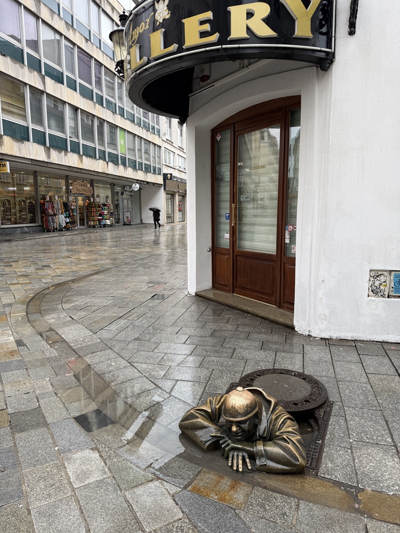 Von dort aus ging es weiter in die liebevoll gestaltete Altstadt. Beim Schlendern durch die kleinen Gassen begegnet man immer wieder besonderen Details – darunter auch die bekannte Statue Čumil, besser bekannt als „der Gaffer“, der neugierig aus einem Kanaldeckel schaut und ein beliebtes Fotomotiv ist.