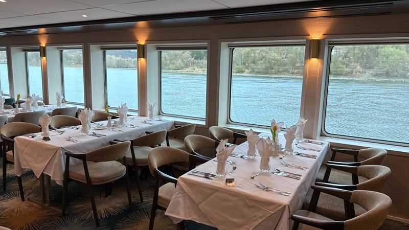 An Bord der MS Rousse Prestige gibt es ein Restaurant. Den Sitzplatz hierzu hat man bereits beim Check-In erhalten. Diesen Sitzplatz hat man die ganze Reise über und der Tisch wird mit anderen Reisenden geteilt. Wir saßen mit netten Mitreisenden an einem 8er Tisch - das war einer der größten Tische, die meisten Tische waren mit 6 Sitzplätzen ein bisschen kleiner.
