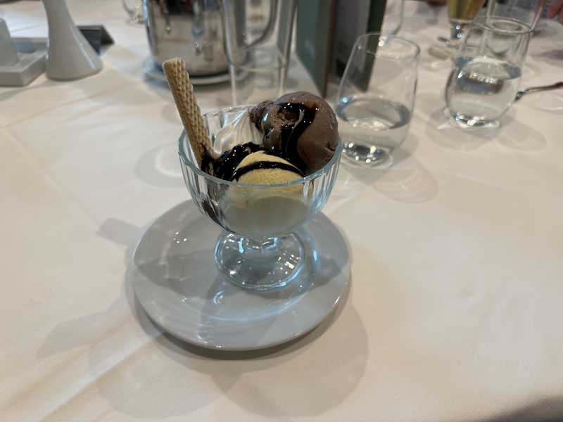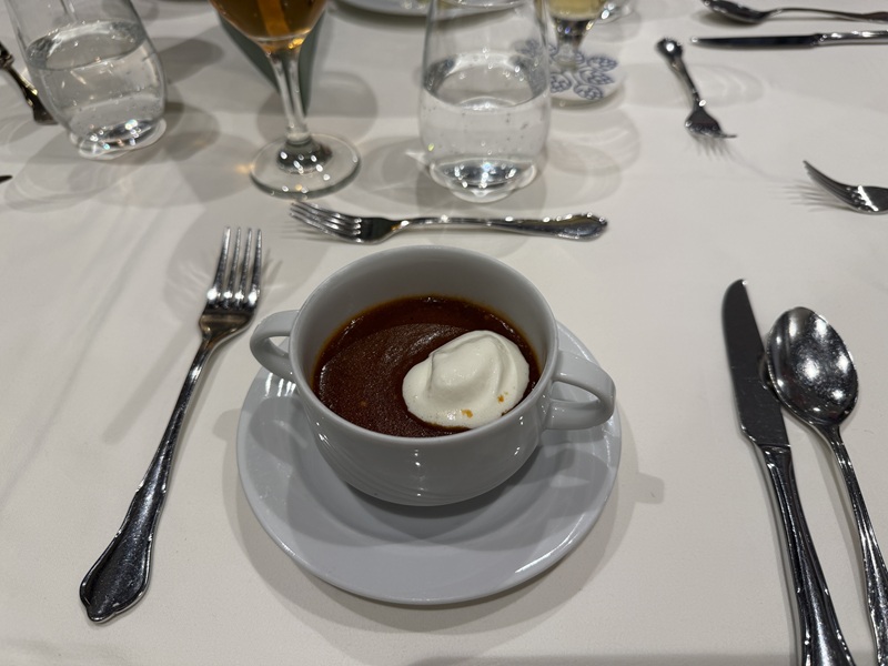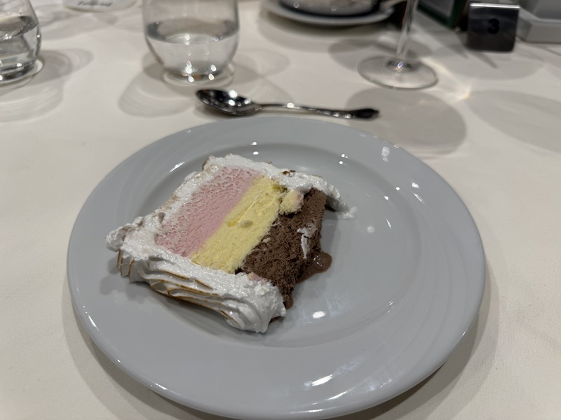 In der Regel gab es immer eine Vorspeise, eine Suppe, 3 Hauptmalzeiten (1x Fisch, 1x Fleisch und 1x Vegetarisch) sowie Desserts zur Auswahl. Das Schiff legte bereits während dem Abendessen zum ersten Hafen der Reise ab. Nach dem ersten Dinner sind wir müde von der Anreise ins Bett gefallen.