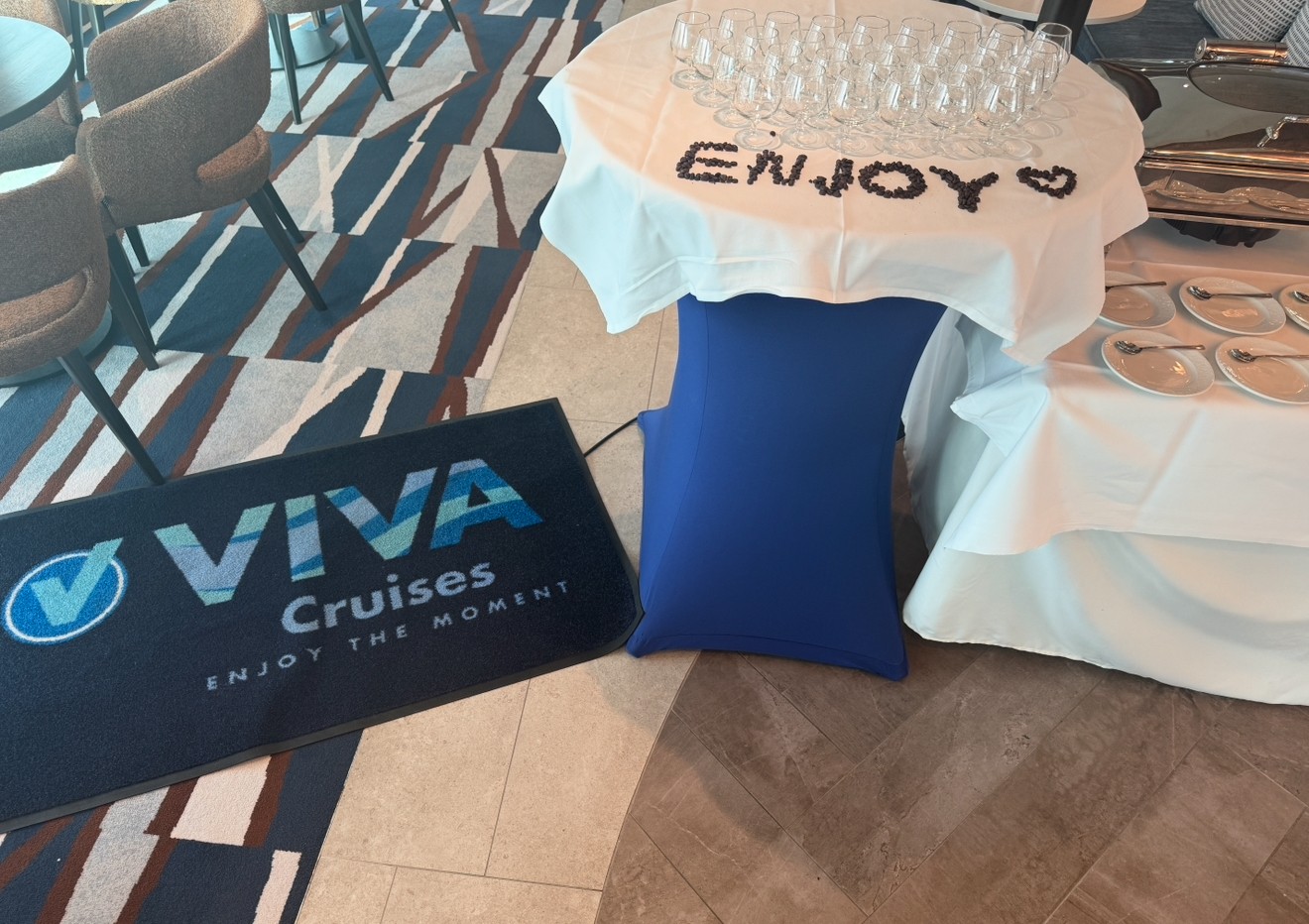 Obwohl die Einschiffung erst um 15:00 Uhr begann, war ich bereits um 12:30 Uhr vor Ort. Ich konnte meinen Koffer abgeben und schon die VIVA ENJOY betreten.
