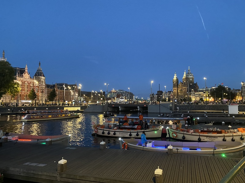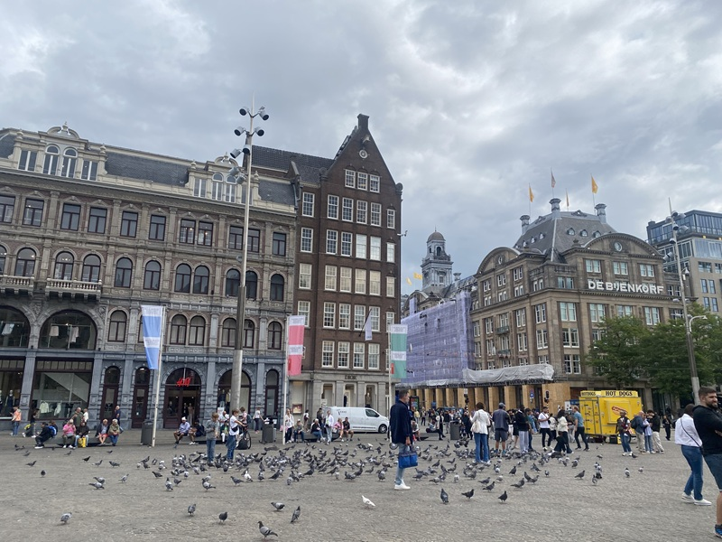 Nach einer ruhigen Nacht bin ich am Morgen erholt aufgewacht und konnte aus dem Bett heraus beobachten, wie die nächste Schleuse passiert wurde. Als ich mich am leckeren Frühstücksbuffet im Panorama Hauptrestaurant etwas gestärkt hatte, sind wir auch schon in den Hafen von Amsterdam eingefahren, was ich staunend vom Außenbereich des The Garden Restaurants ansehen konnte. Bis das Schiff freigegeben wurde, bestellte ich mir an der Bar noch einen Cappuccino und machte mich auf der Kabine bereit für einen Shopping-Vormittag in Amsterdam. Da das Schiff sehr zentral im Hafen im Stadtteil Westerdok lag, war der Weg zum Hauptbahnhof Amsterdam Centraal nicht weit. Durch die Unterführung erreichten wir in nur zehn Gehminuten die Innenstadt. Hier schlenderten wir durch die Shops und über den Dam Platz, vorbei am Madame Tussauds, dem Koninklijk Paleis, der Nieuwe Kerk und dem Nationaal Monument.