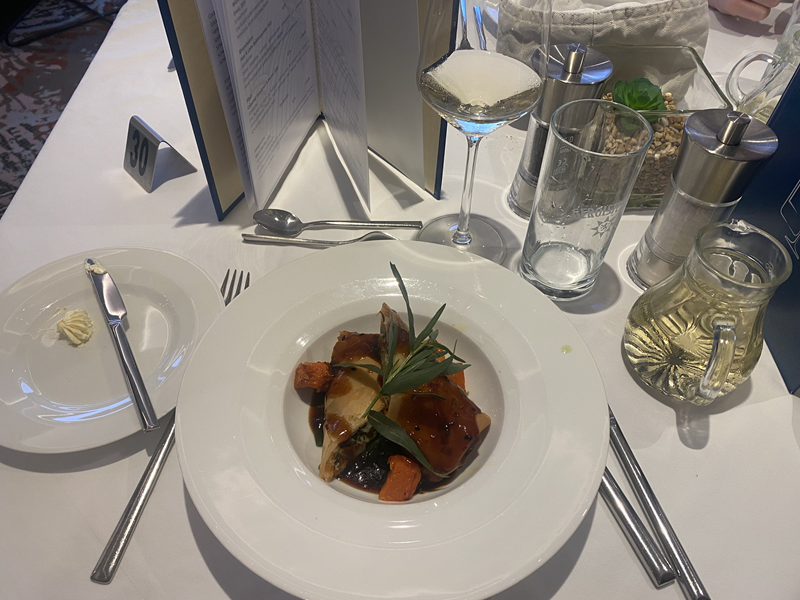 Am Nachmittag hatten wir eine Schulung zu den Produkten von nicko cruises mit dem Außendienstler Alexander Holst. Im Rahmen der Nachwuchsoffensive von BEST REISEN fand auch noch ein Workshop mit Frieder Krauß im Auftrag von Team aha statt. Als das Schiff ablegte, saßen wir noch auf dem Sonnendeck bei einem Aperol Spritz zusammen und genossen die frische Brise, bevor der legendäre Gala Abend startete. Frisch geduscht und schick angezogen, machte ich mich erst auf den Weg zum Sonnendeck für ein Gruppenfoto und im Anschluss weiter in die Panorama Lounge, wo Crew und Kapitän vorgestellt wurden. In feierlichem Anlass wurde uns die Vielfalt der Abteilungen an Bord präsentiert, bevor es zum 6-Gänge Menü ein Deck tiefer in das Panorama Restaurant ging. Das Highlight war definitiv die Eistorte, die vom Service mit Wunderkerzen und lautem Applaus den Weg ins Restaurant fand.