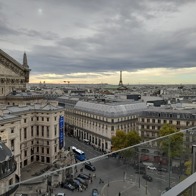 Wir beschließen auch heute wieder viel zu Fuß zu entdecken. So kommen wir an der Galerie Lafayette vorbei und entdecken auf der Dachterrasse Paris von oben.
