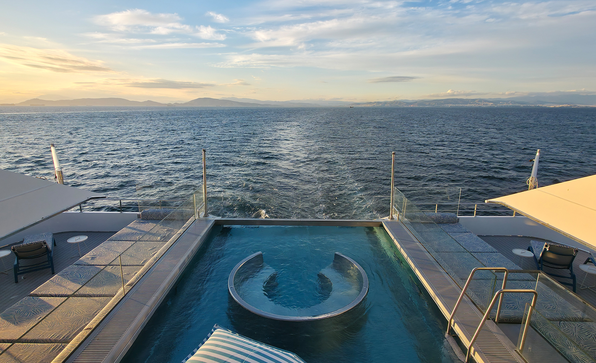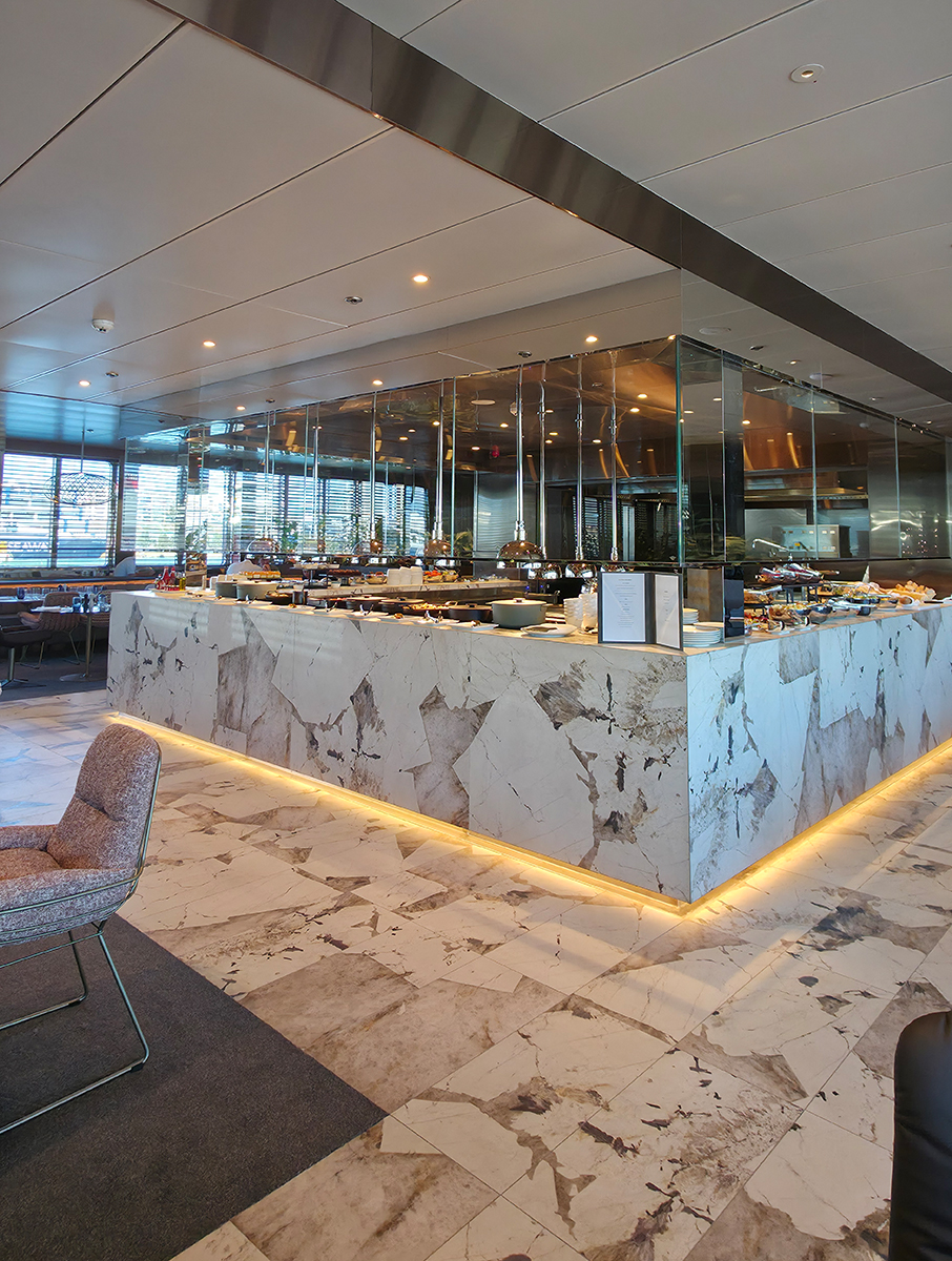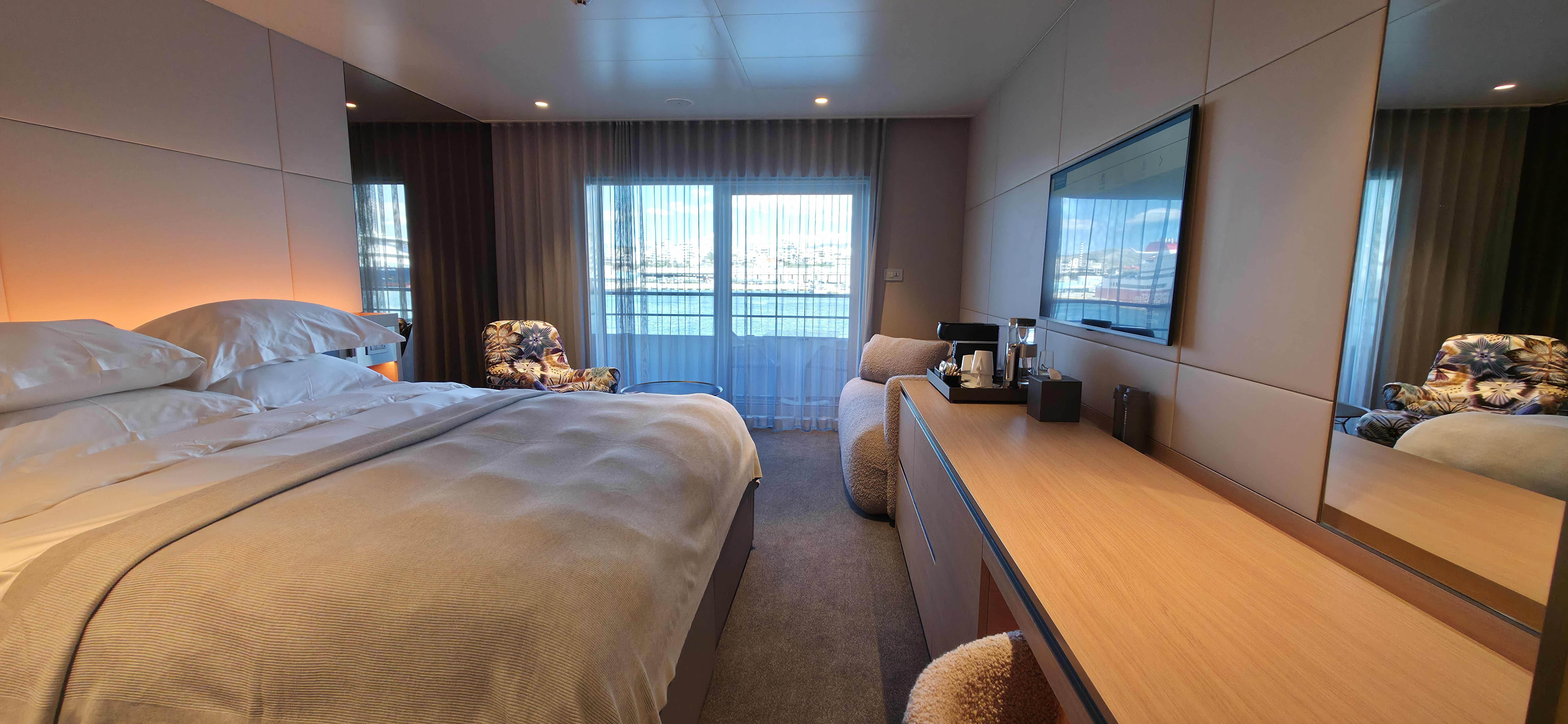 Nach meinem Spaziergang zog es mich zurück an Bord, wo ich die Gelegenheit nutzte, weitere Kabinen zu besichtigen, die extra für uns geöffnet wurden. Den Rest des Tages verbrachte ich entspannt an Bord – unter anderem in der stilvollen Skybar, mit Blick aufs Meer.