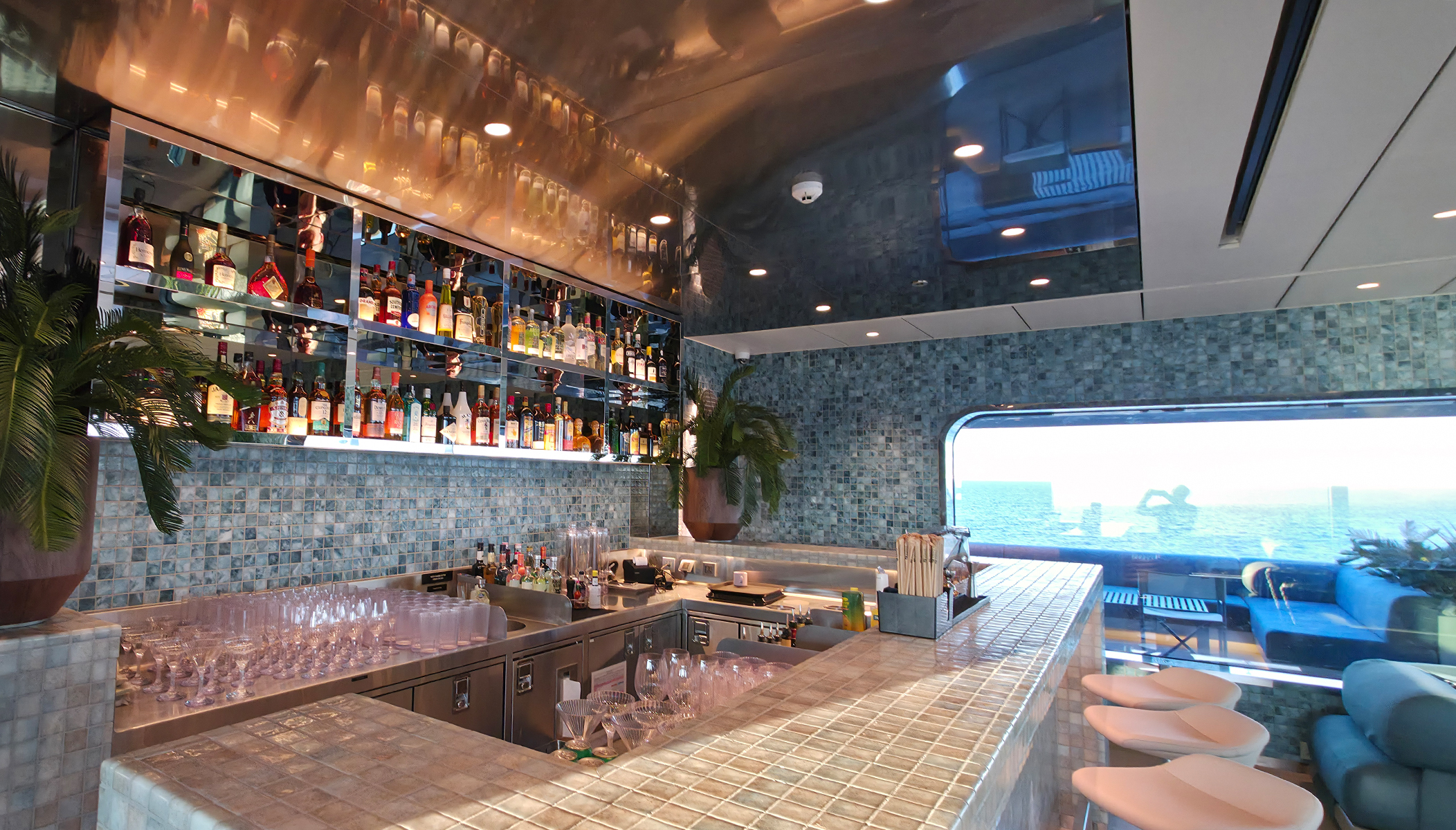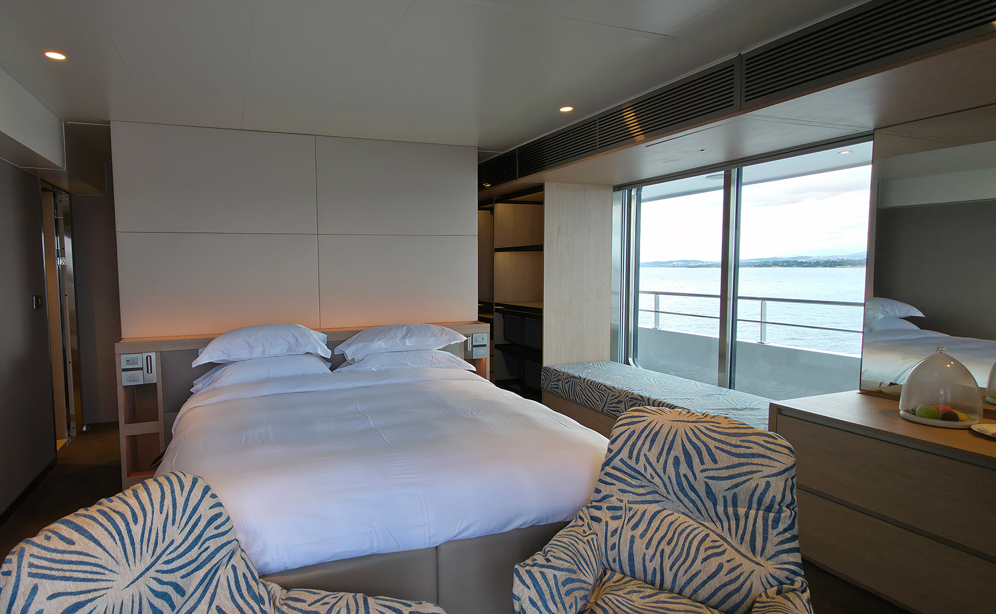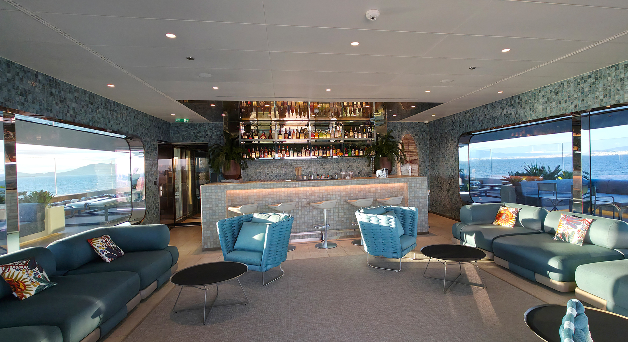 Nach meinem Spaziergang zog es mich zurück an Bord, wo ich die Gelegenheit nutzte, weitere Kabinen zu besichtigen, die extra für uns geöffnet wurden. Den Rest des Tages verbrachte ich entspannt an Bord – unter anderem in der stilvollen Skybar, mit Blick aufs Meer.