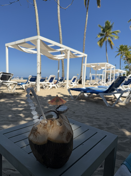 Playa Dorada, zu dem wir uns auch wieder per Uber bringen ließen. Scheinbar ist der Strand privat und nur für Hotelgäste zugänglich, wir lernten aber einen netten Mann kennen, der seinen Freund informierte, dass wir uns dort aufhalten würden. Wir kamen also problemlos rein und es war erstaunlich leer am Strand. Wir kühlten uns im Meer ab und ich besorgte uns an der Hotelbar eine Kokosnuss.