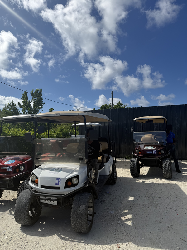 Grand Turk zu erleben. Die Insel war mir vorher nicht wirklich bekannt aber am Ende des Tages war es meine absolut liebste Destination der ganzen Reise. Hier ist es irgendwie Gang und Gebe, sich ein Golfkart zu mieten und auf diese Weise die Insel zu erkunden. Genau das taten wir im Terminal und zahlten 90$ für den ganzen Tag. Der Händler gab uns eine Inselkarte mit und markierte uns ein paar Sehenswürdigkeiten. Unser erster Stop war ein beinahe leerer Strand mit kleinen Felsen, die vom Sand ins Wasser ragten. Während der Weiterfahrt wurde die Straße teilweise von ein paar wilden Eseln blockiert und unser nächster Stop führte zur Tankstelle, wo wir uns für 7$ den Tank füllen ließen. Eigentlich sind wir planlos rum gefahren und haben dabei die schönsten Ecken der Insel kennengelernt. Wir kamen an einem wunderschönen Steg an mit türkis blauem Wasser und keinem einzigen Menschen weit und breit. Der Weg führte durch kleine Gässchen am Meer entlang zum nächsten Strand. Mit nicht mal zehn anderen Touristen waren wir hier komplett für uns. Wir badeten in unfassbar türkis farbenem Wasser, sammelten Steine und entspannten im Sand in der Sonne. Nach der kleinen Abkühlung brachte uns die Karte auf Umwegen durch wunderschöne Landschaft zum Leuchtturm. Auch hier machten wir eine Pause, um am Lookout ein paar Fotos zu schießen.