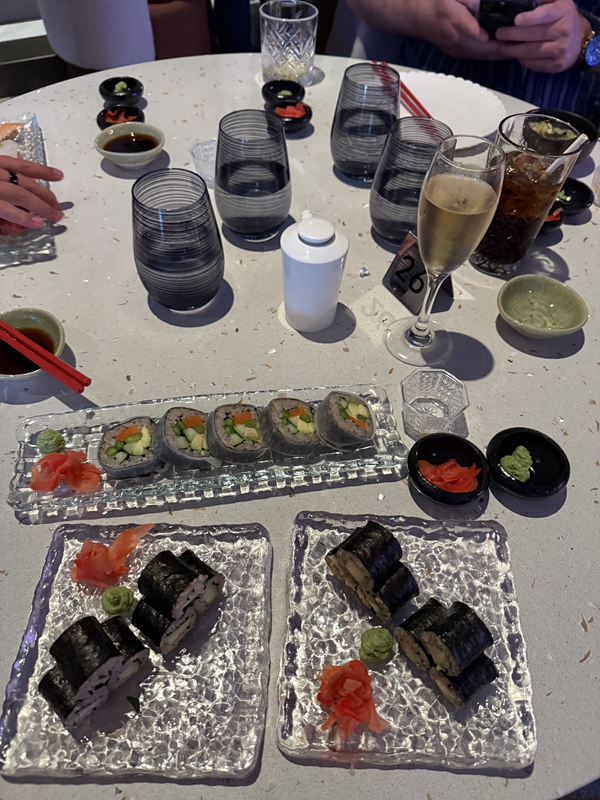Makoto Ocean verabredet. Für die Jungs gab es eine Sushi Variation aus acht Gängen , für mich als Vegetarierin gab es die drei vegetarischen Optionen a la carte´ und meine Freundin bestellte California Rolls. Ein leckerer Sake und Champagner machten das Special Dining Erlebnis komplett.