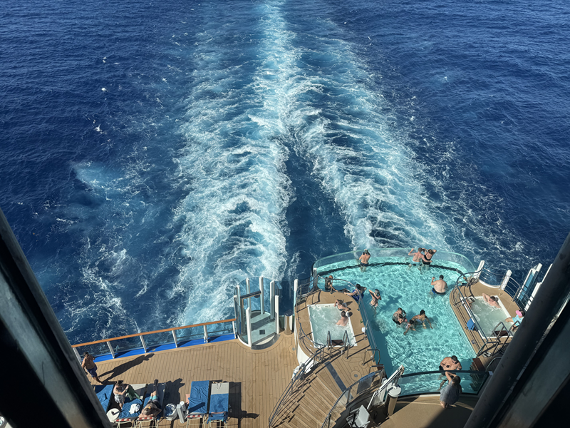 Wake View Terrace wurde von dem Tag an auch unser liebster Spot an Bord. Ein wunderschöner Blick auf die Heckwelle, während man auf einer der Liegen entspannen kann oder im Infinity Pool, verziert mit zwei Hot Tubs links und rechts, das angenehm kühle Wasser spürt. Die