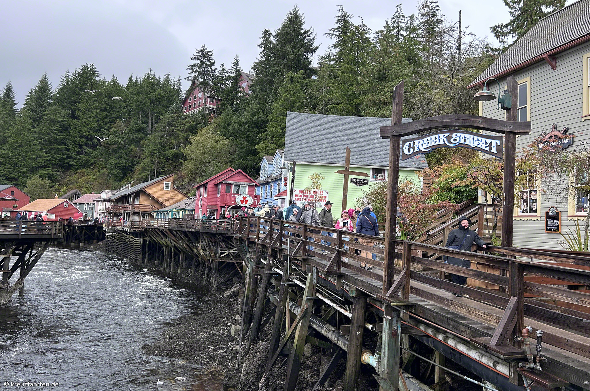 Ketchikan,ein Ort, an dem die Indianer noch vor 150 Jahren völlig unbehelligt von den Weissen in ihrer 12.000 Jahre alten Kultur gelebt haben. Es ging ihnen gut, sie führten ein ruhiges, geregeltes Leben. Dann kam ein gewisser Mr. Martin aus Oregon und eröffnete eine Fischfabrik, später ein Sägewerk und alles änderte sich.Um 1900 setzte auch noch der Goldrausch ein.Heute ist der Tourismus die Haupteinnahmequelle (bis zu 600.000 Toursisten besuchen jährlich den kleinen Ort), danach folgen Fisch- und Holzindustrie.